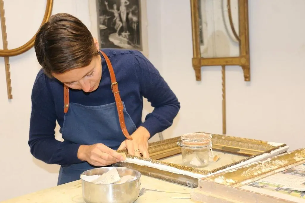 Dernière étape avant la dorure à proprement parler : la reparure. Il s’agit de restaurer les moulures et les ornements. Un véritable travail de sculpture. Enfin, la doreuse passe à l’habillage avec des feuilles d’or, si fines qu’on ne peut pas les tenir avec les mains, au risque qu’elles se désagrègent.