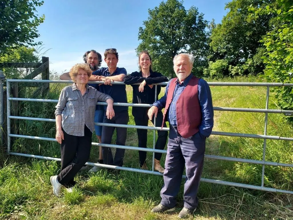 Marie-France Santon, Manuel Olinger, Gregori Derangère, Julie Delaurenti et Pierre Santini à la ferme pour une pièce sur la transmission rurale. © Ouest-France