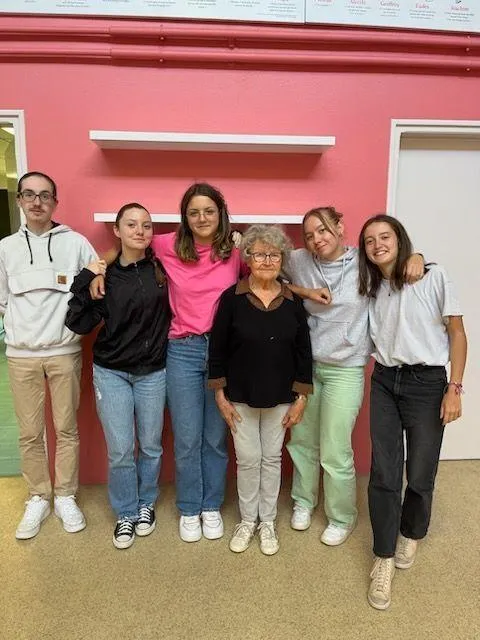 Évelyne Chrétien, au centre, entourée des jeunes de la troupe Vanikoro recomposée pour la circonstance. De gauche à droite : Clément, Aurore, Zoéline, lycéens ; Maëlis et Tara, collégiennes. © Vanikoro