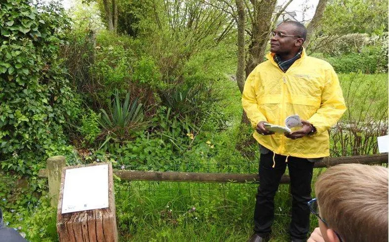 Roberson Pierre, poète, lit son texte apposé sur une des bornes du chemin des Poètes. © Printemps de Durcet