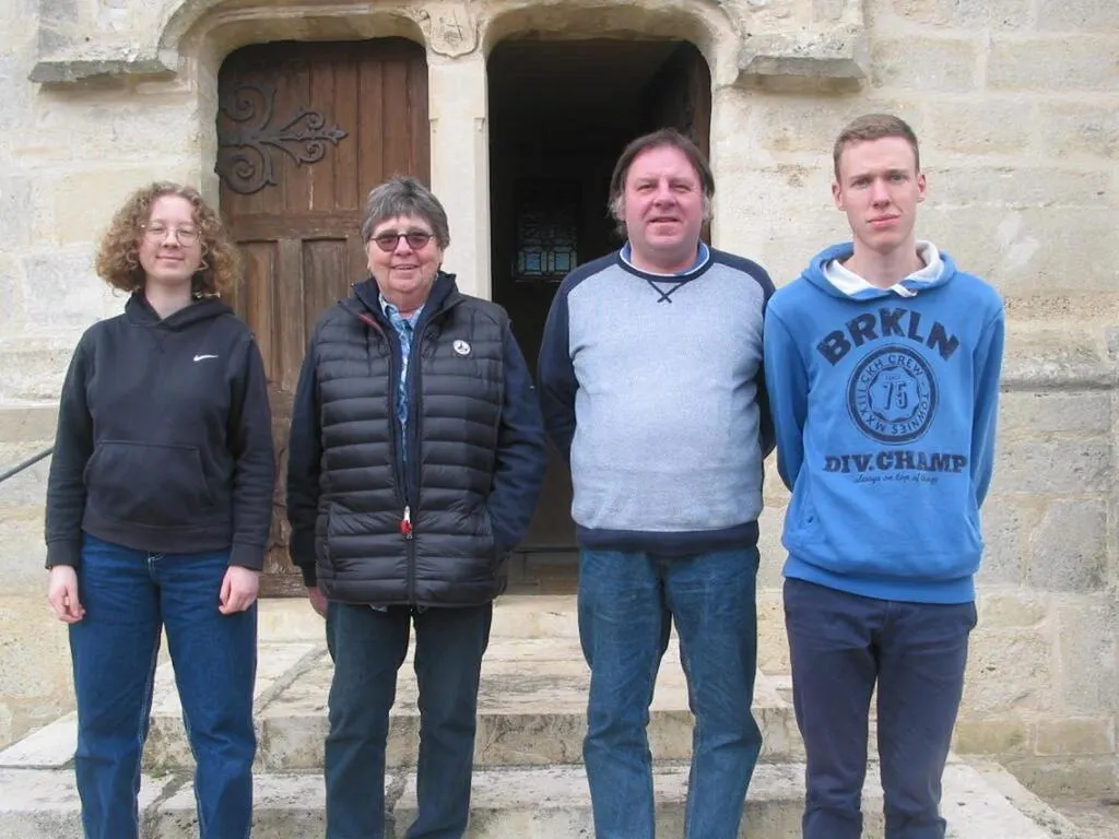 De gauche à droite : Léa Millot (service civique), Anne-Marie Foubert, Laurent Dutertre (historien local), Mathieu Lebrun(service civique). © Ouest-France