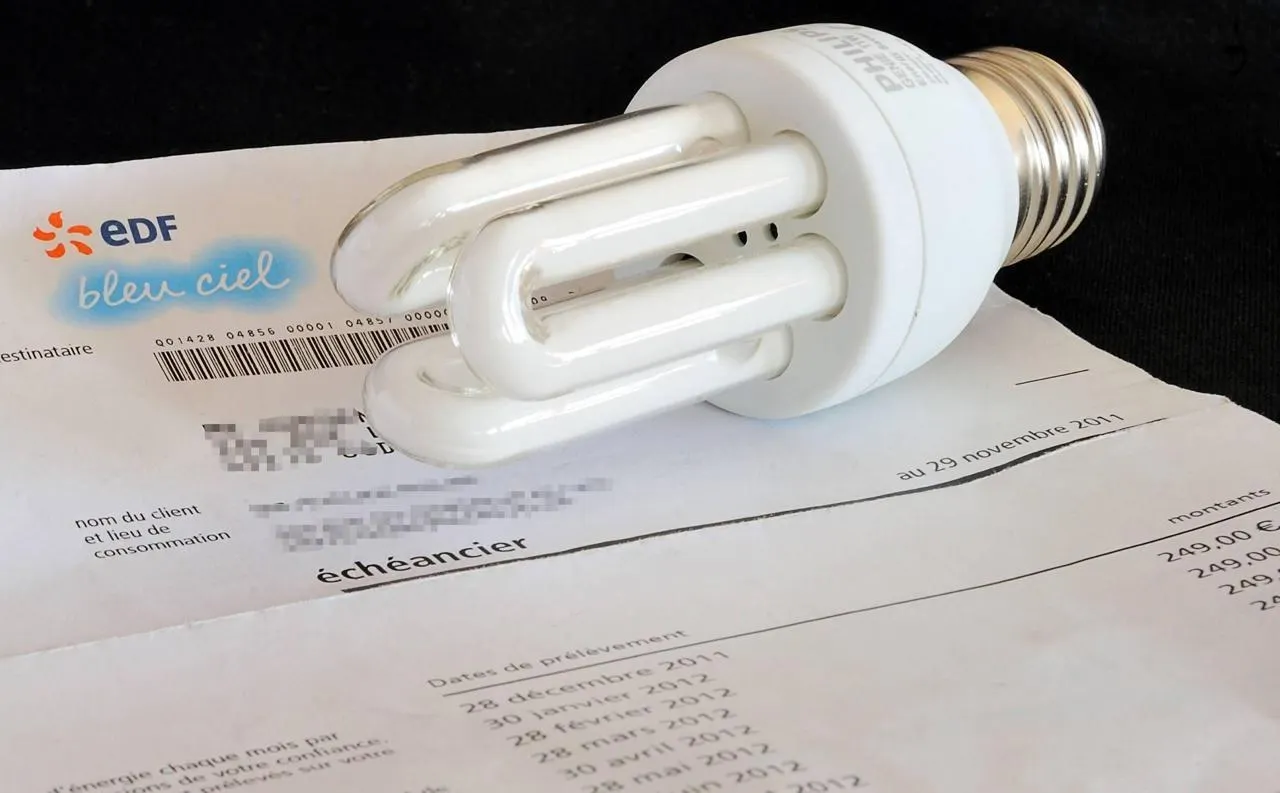 Photo prise le 6 janvier 2012 à Godewaersvelde d’une ampoule basse consommation posée sur une facture d’EDF. © AFP