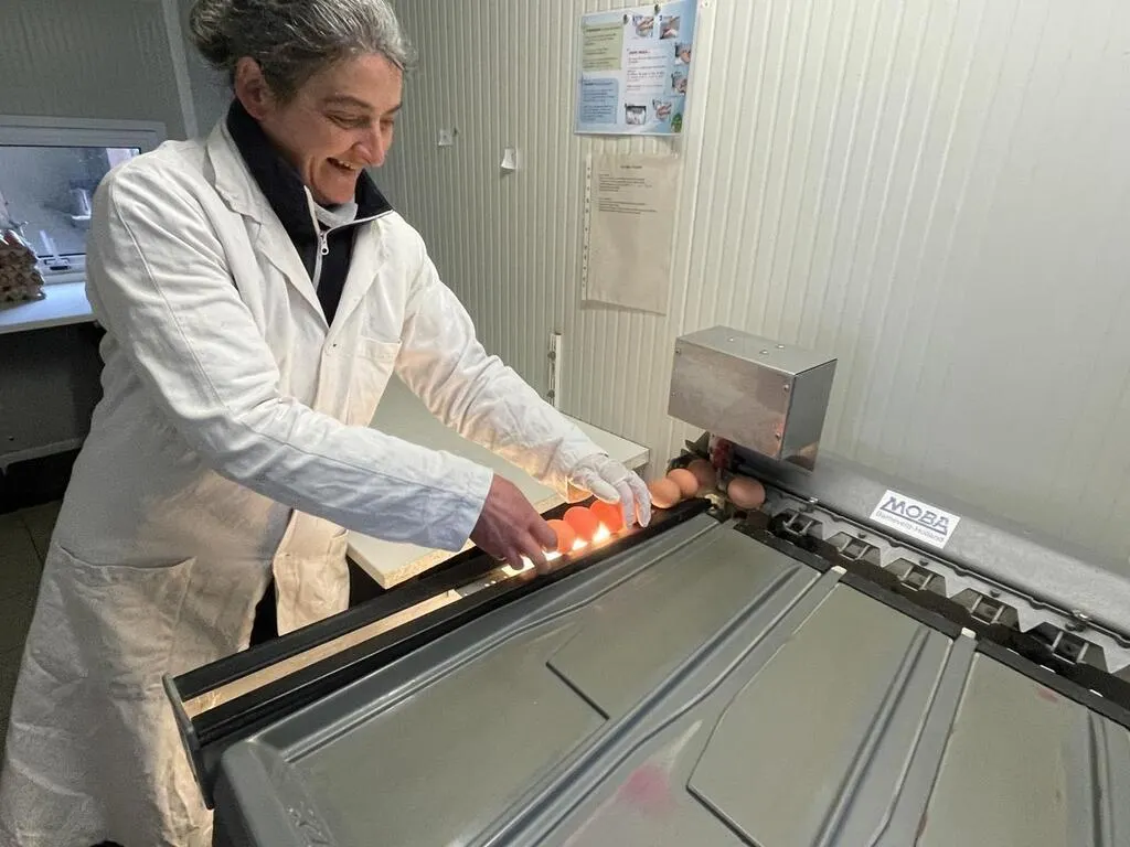 Après le ramassage des œufs fraîchement pondus, Clarisse Jouandet les place dans une calibreuse qui classera chaque œuf en fonction de sa taille. © Ouest-France