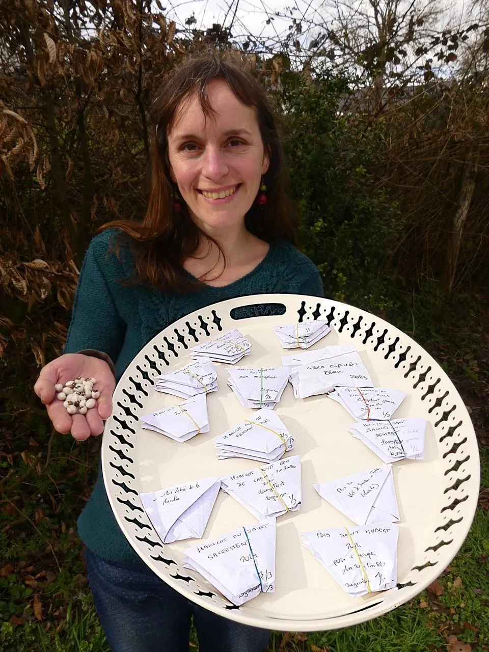 Viviane Derouet présente ici des graines de haricots à écosser du Saint Sacrement et des paquets de graines à planter. © Viviane Derouet