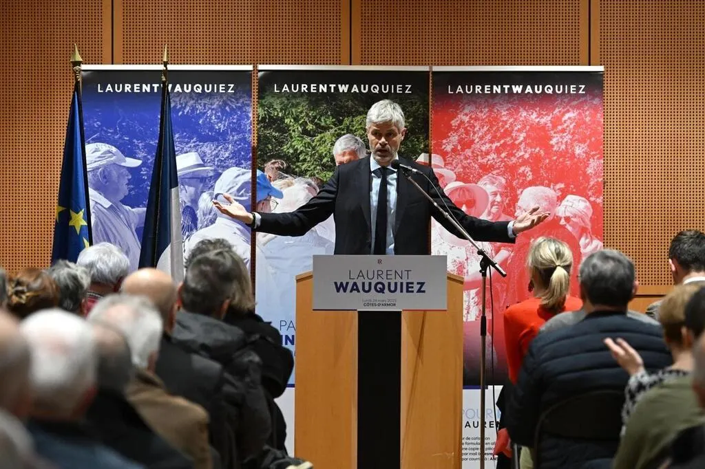 Laurent Wauquiez pendant une réunion publique, le 24 mars 2025, à Langueux (Côtes-d’Armor). © Archives Thomas Brégardis / Ouest-France