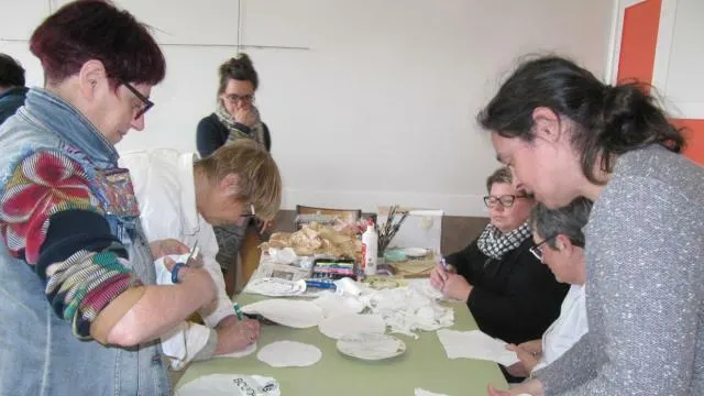 Gine Guibout, à gauche, Iris Harivel, au fond à gauche, ont démarré la fabrication des fleurs de rêves avec les personnes présentes samedi. © Ouest-France