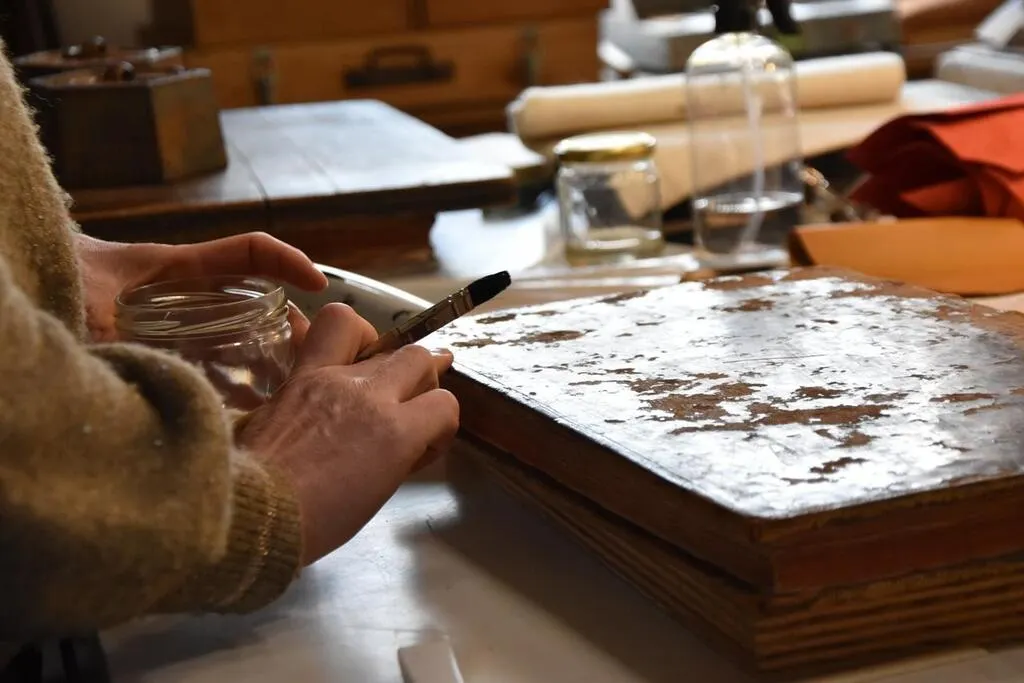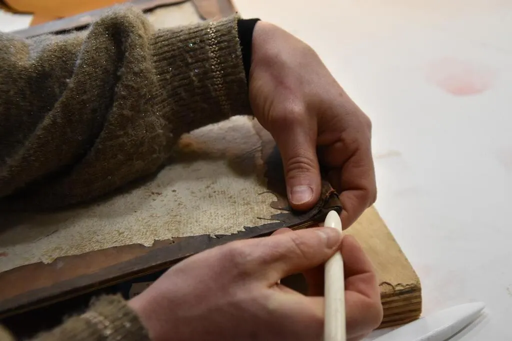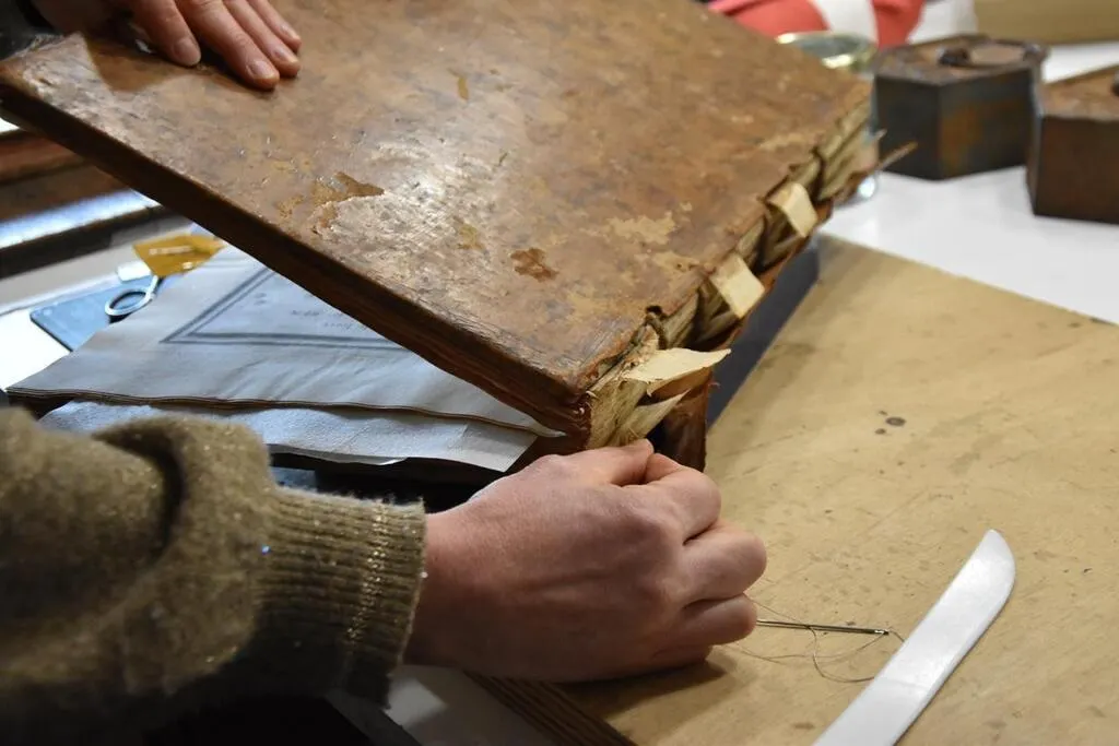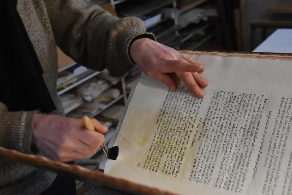 Le scalpel pénètre dans le coin de l’ouvrage, soulève la peau. L’intervention est délicate : décoller la couverture sur une trop grande surface serait invasif, mais en se restreignant, le cuir pourrait se déchirer. La main d’Anne-Elisabeth Gillot ne tremble pas. À l’aide d’une pince, elle insère une fine pièce de cuir de veau ...