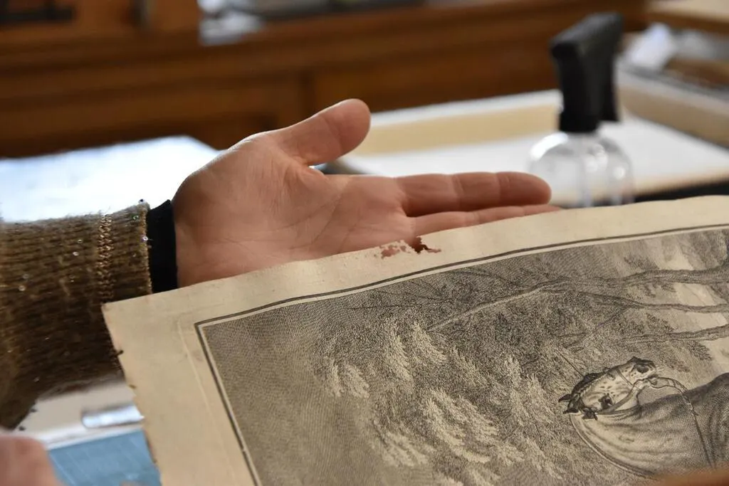 Le dos de l’ouvrage « École de cavalerie », du Haras du Pin, est très endommagé. La restauratrice Anne-Elisabeth Gillot a dû l’ouvrir afin de pouvoir intervenir. © Ouest-France