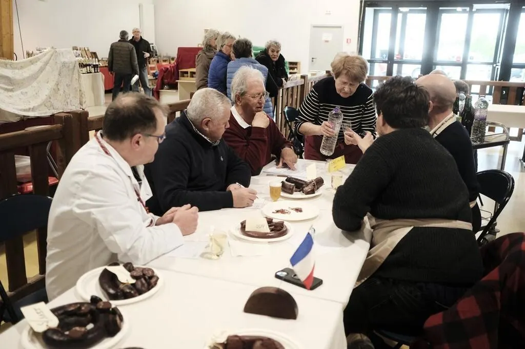 Une centaine de jurats notent les boudins sur des critères précis lors de la première manche du 62e concours international du meilleur boudin, à Mortagne-au-Perche (Orne). © Ouest-France