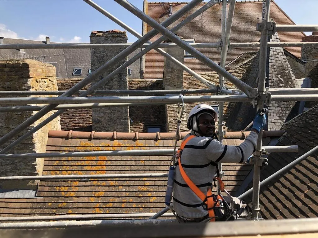 L’un des employés de la société FMS Ringue, chargée d’échafauder le chantier, évolue à près de quinze mètres de hauteur. Lorsqu’il sera terminé, l’échafaudage couvrira le toit. © Ouest-France