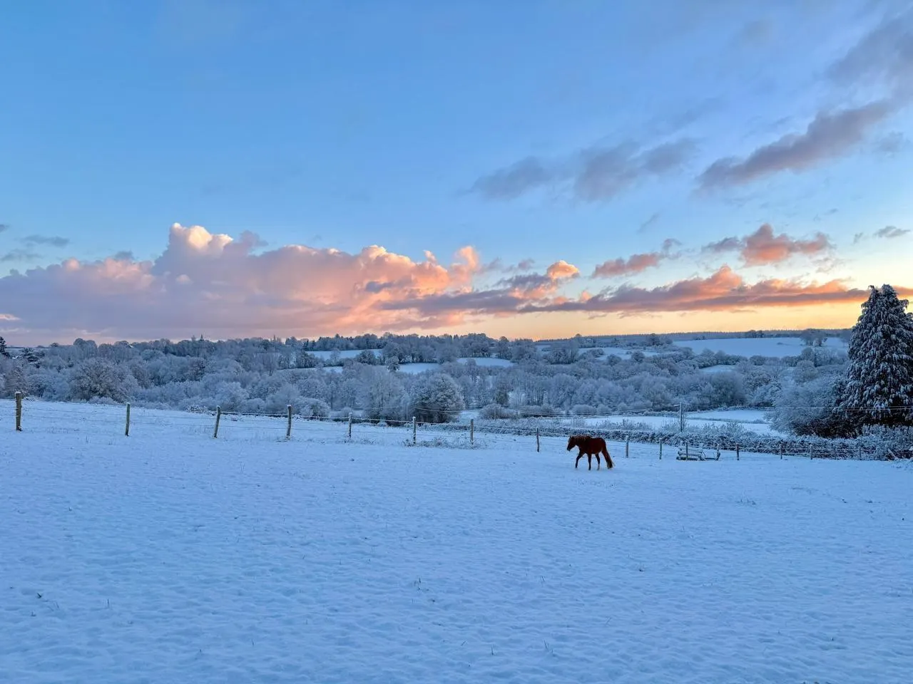 Quand le soleil se lève sur les paysages enneigés de Normandie, cela donne un décor à couper le souffle, comme ici à Beaufai dans l’Orne. © Photo fournie par Janine CLOUET