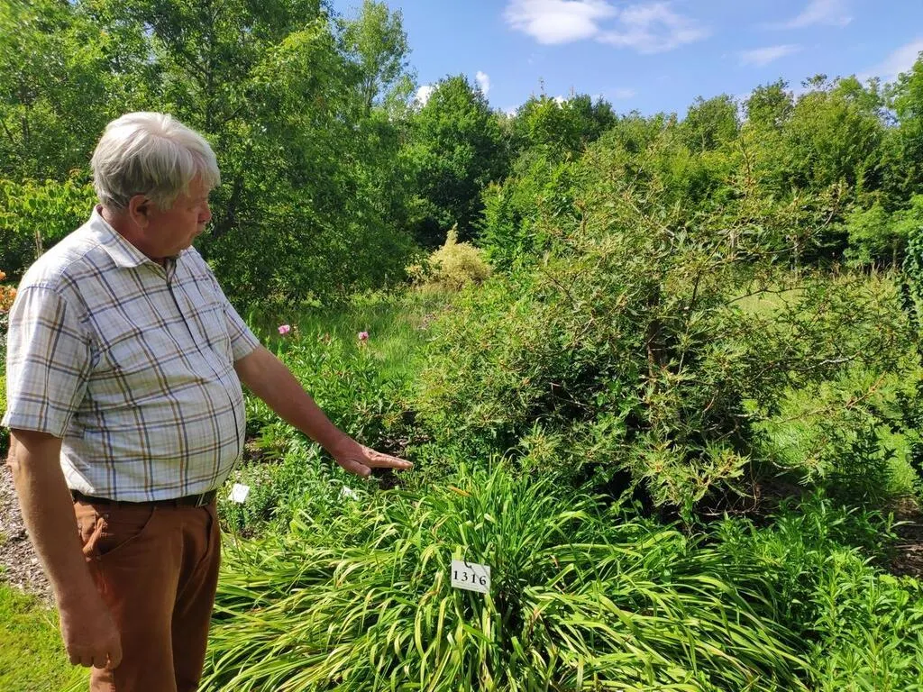 Jean-Pierre Jacob, propriétaire avec Roselyne, sa compagne, du jardin, pointe du doigt l'un des plus petits chênes du monde qui ne dépassera pas les 4,5 m à l'âge adulte. © OUEST-FRANCE