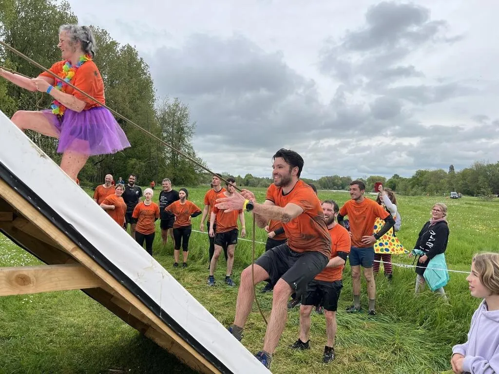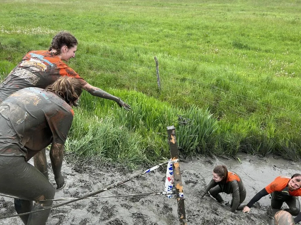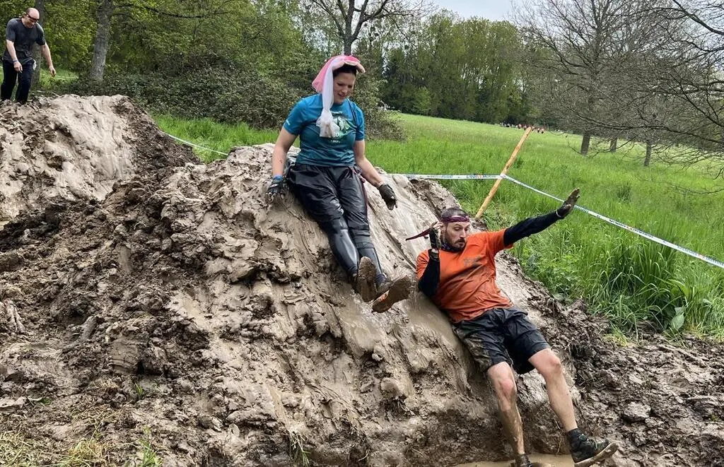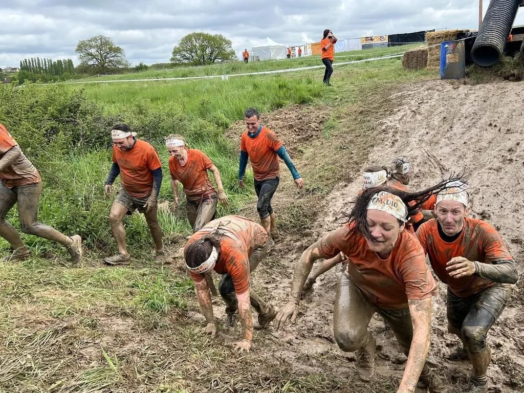 « Profitez de votre t-shirt propre, ça ne va pas durer ! » Au croisement de l’étang de la Croix-Lamirault, à L’Aigle (Orne), l’équipe bleue encourage l’équipe orange. L’une vient de passer la mare de boue, la seconde s’apprête à prendre le bain.