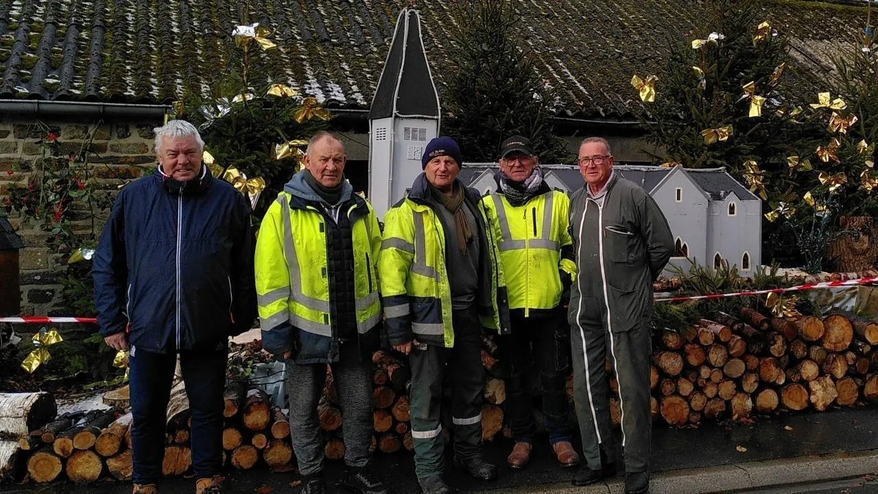 À Saint-Germain-du-Crioult, à Condé-en-Normandie (Calvados), une trentaine d’habitants s’occupent d’installer d’innombrables décorations de Noël pour illuminer leur village. Ici, de gauche à droite, Serge Locret, Francis Maurice, Alain Lequertier, Pascal Eucher et Pascal Robin, chargés de vérifier les branchements électriques, vendredi 21 novembre 2025. © Ouest-France