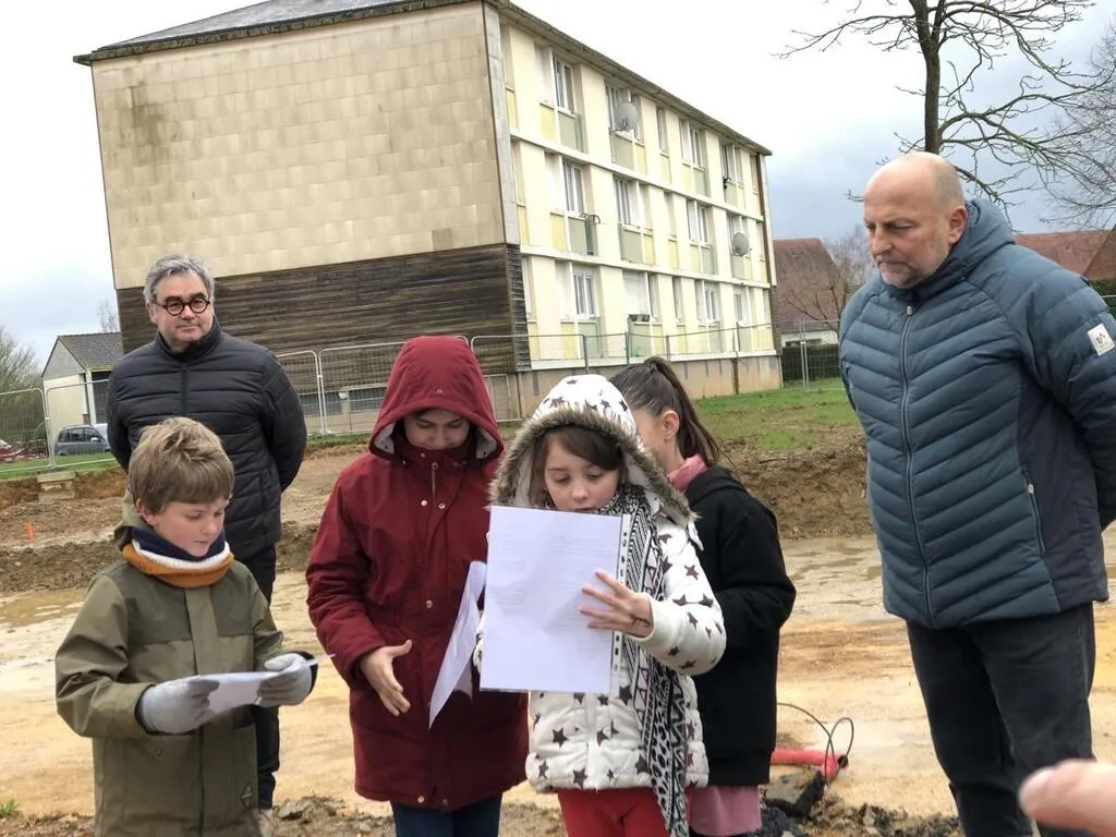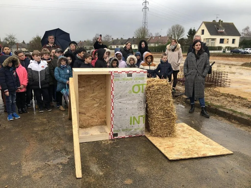 La pose de la première « botte de paille » de la future école de la rue du 6-Juin, à Argentan (Orne), a été symboliquement posée lundi 11 mars. Des écoliers d’Anne-Frank ont récité des poèmes et un parchemin a été déposé sous la paille de ce premier élément d’un bâtiment bioclimatique.