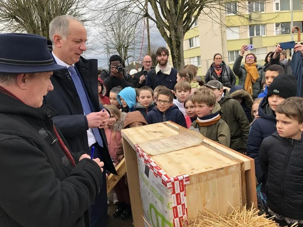 L’école Anne-Frank était présente pour cette petite cérémonie de la première « botte de paille » de la future école de la Vallée d'Auge. © Ouest-France
