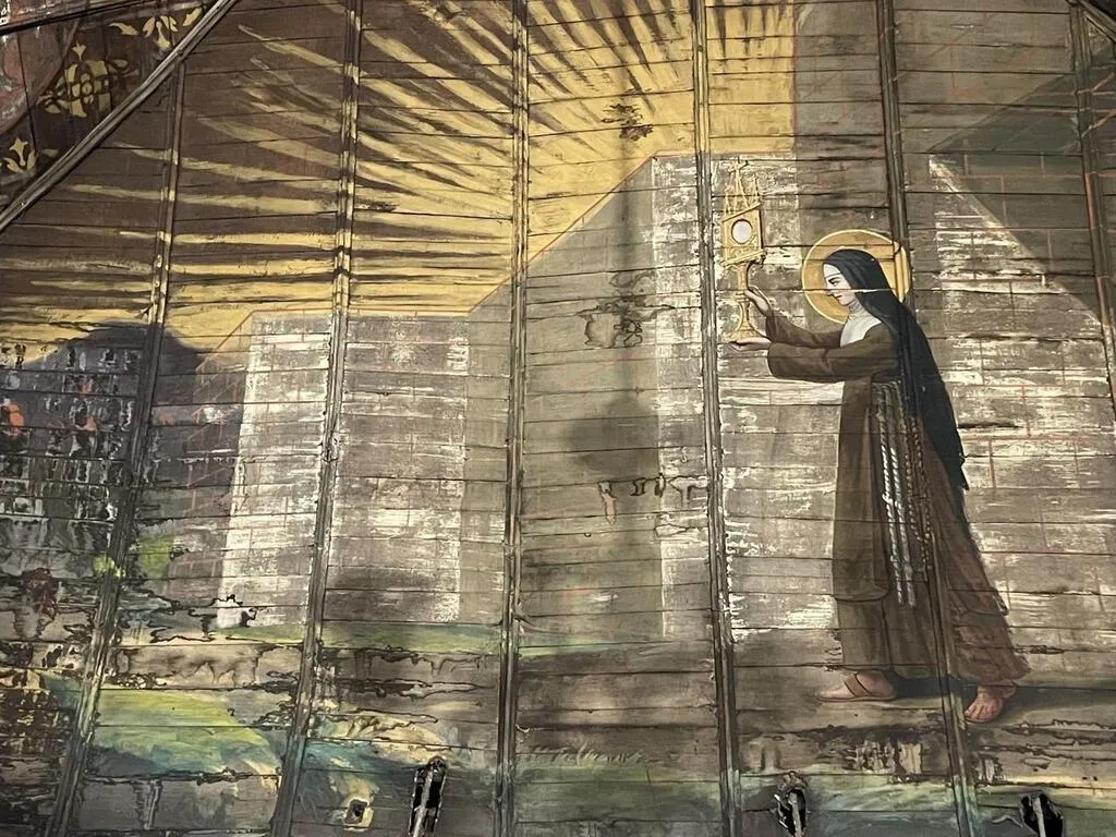 Au fond de la chapelle, une fresque représente Sainte-Claire chassant les Sarrazins à l’aide du Saint-Sacrement. Ouest-France