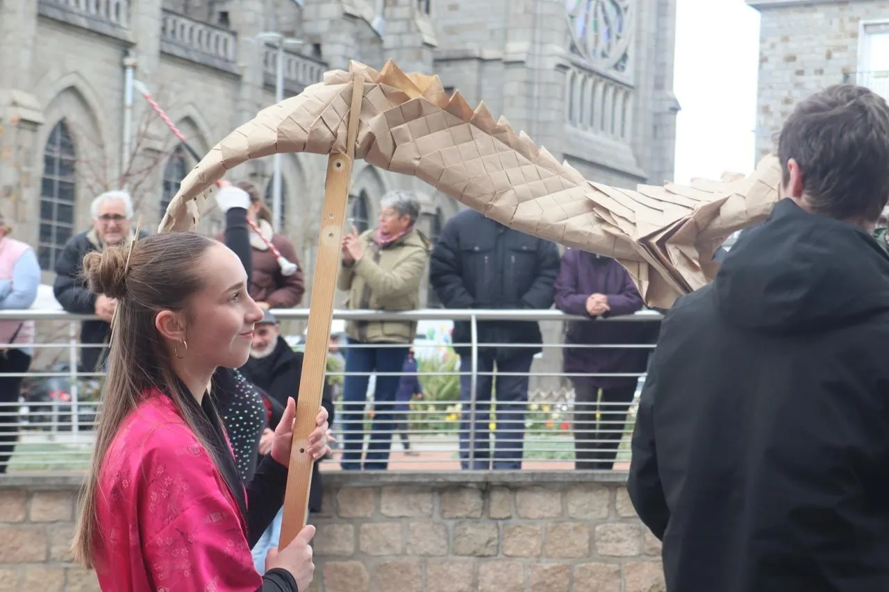 La Maison des jeunes et de la culture (MJC) de Flers (Orne) a défilé avec le cirque Tempo dans le centre-ville avec leur dragon réalisé par leurs soins avec des matériaux recyclés à l’occasion du carnaval de Flers, dimanche 29 mars 2026. © Ouest-France