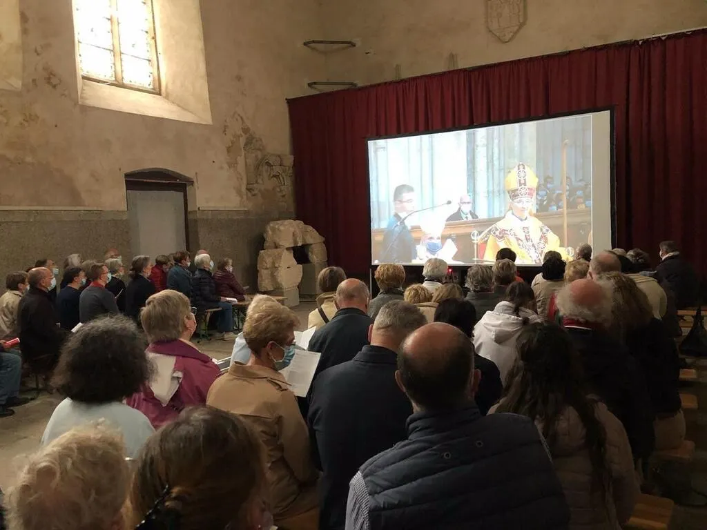 Dans la chapelle canoniale, 200 personnes suivent l’installation du nouvel évêque sur un écran géant. Ouest-France