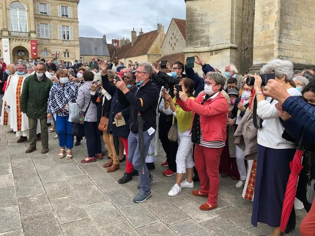 Un attroupement se forme à la sortie de la cathédrale, à l’issue de la messe. Pour prendre en photo le nouvel évêque de Séez et les évêques qui ont participé à sa cérémonie d’installation.