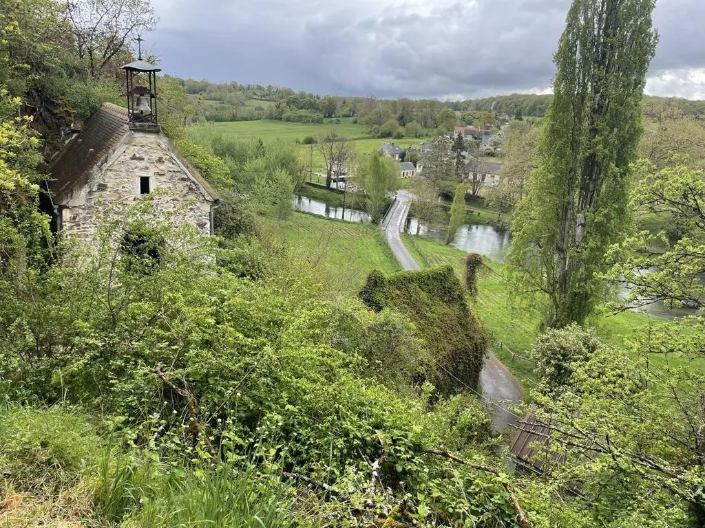 Immédiatement se dresse devant nous une petite falaise, surmontée du château Mesnil-Glaise. « Cet éperon rocheux marque la frontière entre le bassin parisien, situé plus à l’est, et le massif armoricain », indique le panneau explicatif. Malheureusement, la bâtisse du XIXe siècle construite sur les anciens vestiges d’un château fortifié, n’est pas visitable.