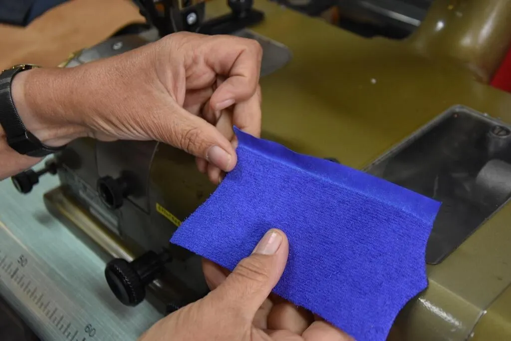 À l’aide d’une machine à parer, la maroquinière affine les bords du cuir qu’elle va ensuite replier pour créer des rembords. Ouest-France