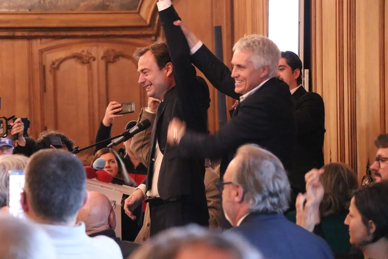 Aristide Olivier, maire sortant de Caen (Calvados), a remporté le second tour des élections municipales, dimanche 22 mars 2026. Ici à l’hôtel de ville caennais, derrière Rudy L’Orphelin au micro, qui portait une partie de l’union de la gauche, arrivé en deuxième position. Ouest-France