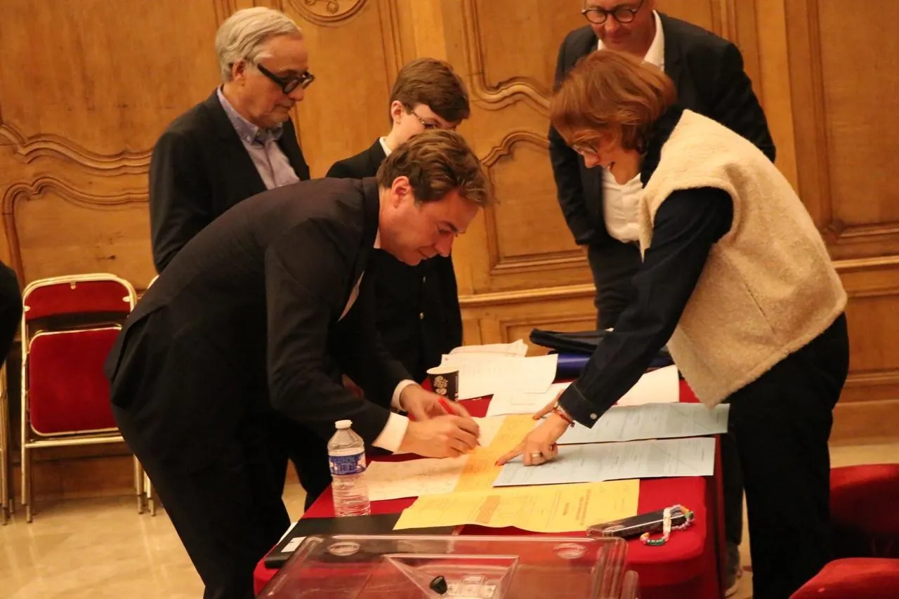 Quelques dernières signatures au bureau de vote de l’hôtel de ville, avant de filer sur les plateaux TV et radio… puis faire la fête avec son équipe, pour Aristide Olivier, gagnant du second tour des élections municipales 2026 à Caen (Calvados). Ouest-France
