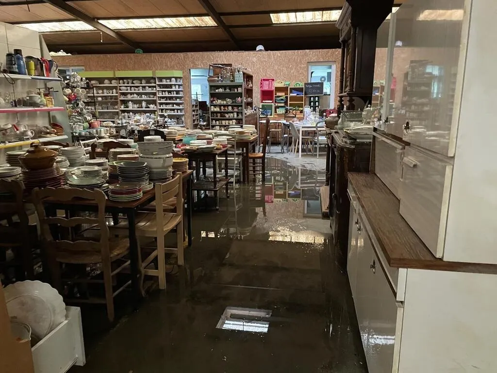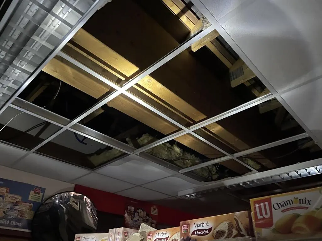 Les faux plafonds de l’épicerie de Landisacq se sont effondrés sous le poids des grêlons, vendredi 13 juin 2025. © Ouest-France