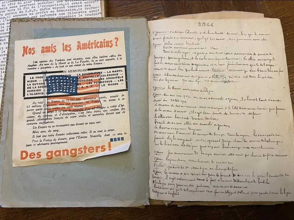 Dans son Journal de la guerre, Xavier Rousseau rédige ce qu’il sait de la vie argentanaise, et collecte aussi des documents (ici de la propagande anti-américaine). © Ouest-France