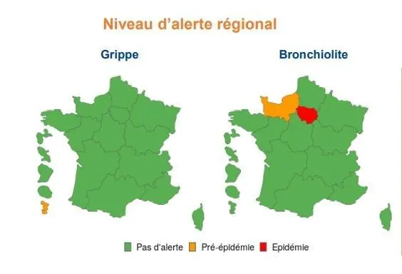La bronchiolite, elle, est « en phase pré-épidémique pour la 4e semaine consécutive. Les indicateurs hospitaliers (urgences, hospitalisation) sont en augmentation constante et à des niveaux moyens, poursuit l’agence nationale de santé publique sous tutelle du ministère chargé de la Santé. En ville (SOS Médecins), l’activité stagne à un niveau modéré. Le taux d’isolation du virus VRS dans les laboratoires augmente à l’hôpital mais reste globalement faible. »