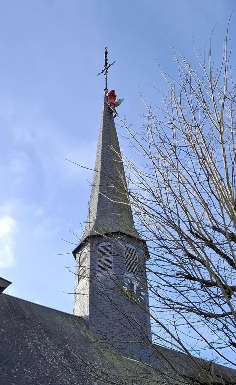 La municipalité d’Auguaise avait installé ce Père Noël au sommet de l’église, mais le curé leur a demandé de le retirer. Ce sont les sapeurs-pompiers qui sont montés pour l’enlever. © Photo fournie par Sylvie Molero