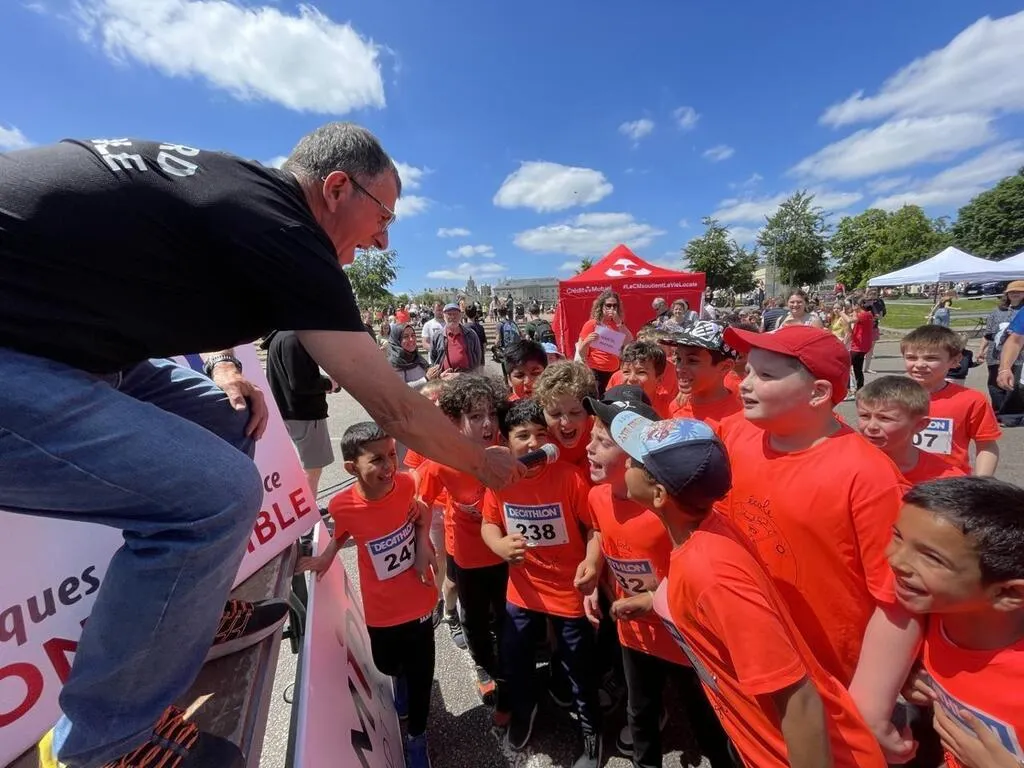 Le speaker de la Bayard athlétisme, Jean-Luc Edeline, fait participer les jeunes coureurs. Ouest-France