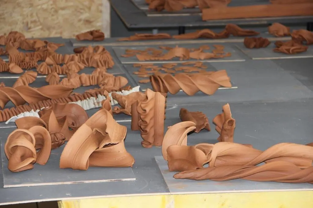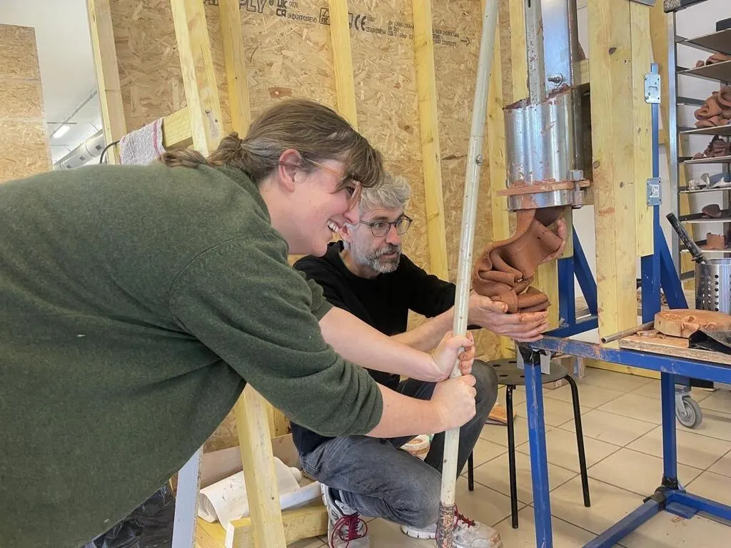 « Nous avons eu cette idée, en observant les colliers de pates des enfants », se rappelle l’artiste Bevis Martin. Charlie Yunde et Bevis Martin travaillent depuis le début du mois d’octobre 2024 dans la résidence d’artiste 2angles à Saint-Georges-des-Groseillers (Orne). Ils tentent d'obtenir des « formes organiques en céramique » en s’inspirant de celles des pâtes.