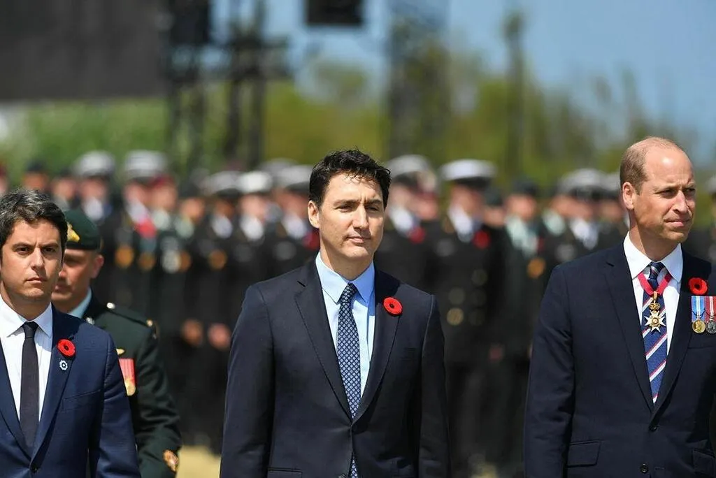 Le 6 juin 2024, Justin Trudeau, Premier ministre du Canada, a assisté à la cérémonie commémorative du D-Day, à Courseulles-sur-Mer (Calvados) avec Gabriel Attal, Premier ministre, et le prince d’Angleterre, William. © Archives Mathis Harpham / Ouest-France