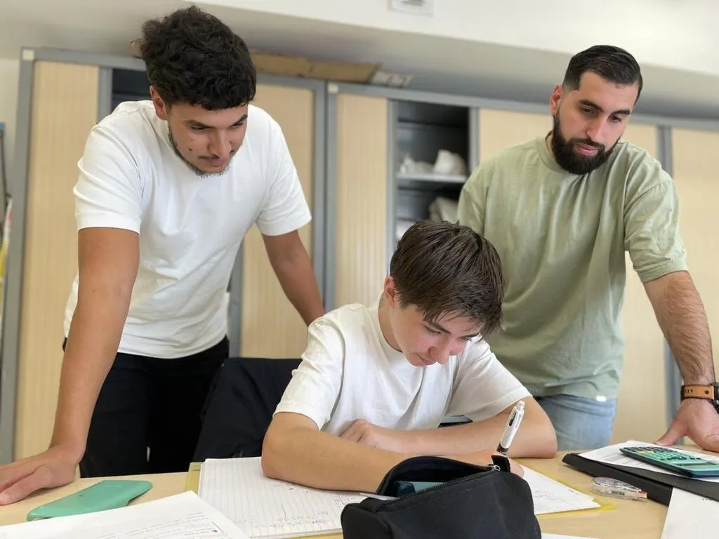 Ayoub Assa et Elyès Moualid, professeurs de mathématique, assure des sessions d’aide aux devoirs dans le quartier de Perseigne, à Alençon. © Ouest-France
