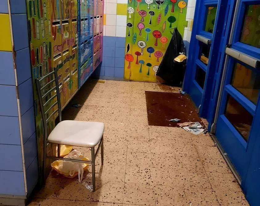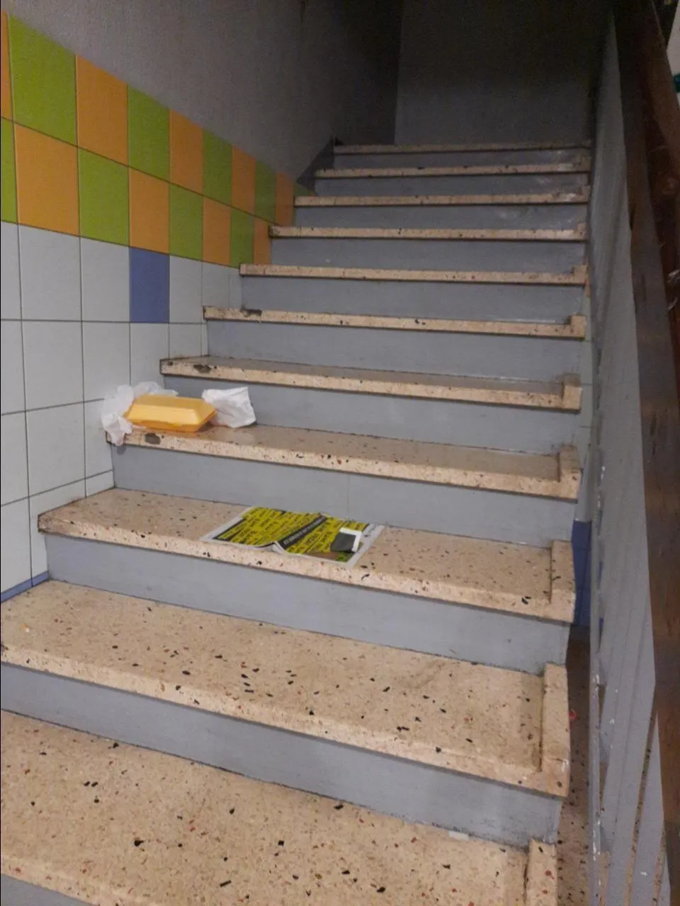 Une chaise, destinée au vendeur, est installée en permanence dans le hall de la tour Pascal, quartier de Perseigne, à Alençon. Les déchets jonchent le sol. © DR