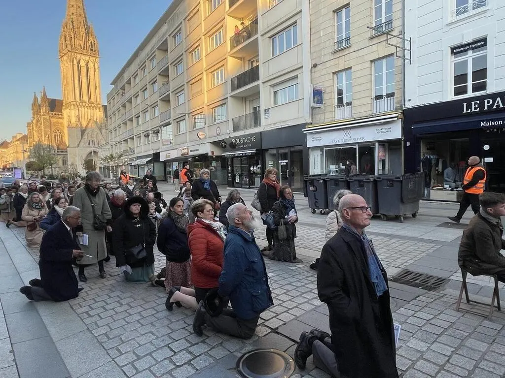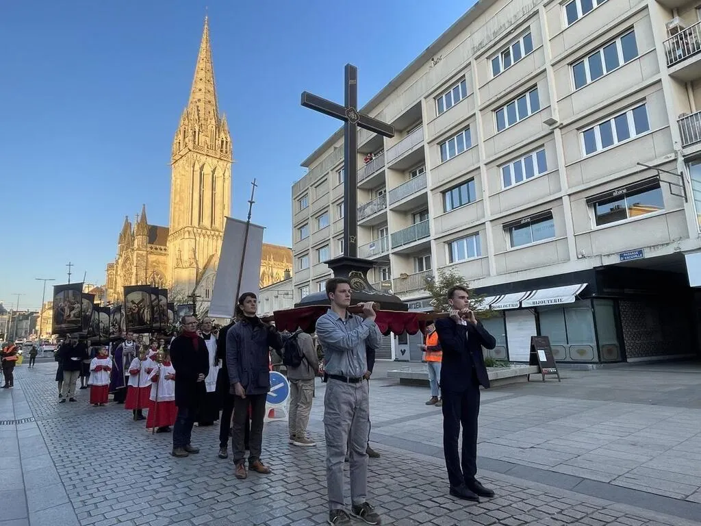 Les fidèles de la Fraternité Saint-Pie X (FSSPX) prennent la rue, à Caen, le 1er avril 2025, pour protester contre une pièce qu’ils jugent « blasphématoire », programmée, le soir même, au Théâtre de Caen. Ouest-France