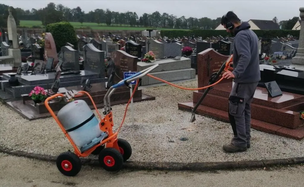 Les agents des services d’espaces verts de Saint-Georges-des-Groseillers (Orne) brûlent les mauvaises herbes du cimetière. © Ouest-France