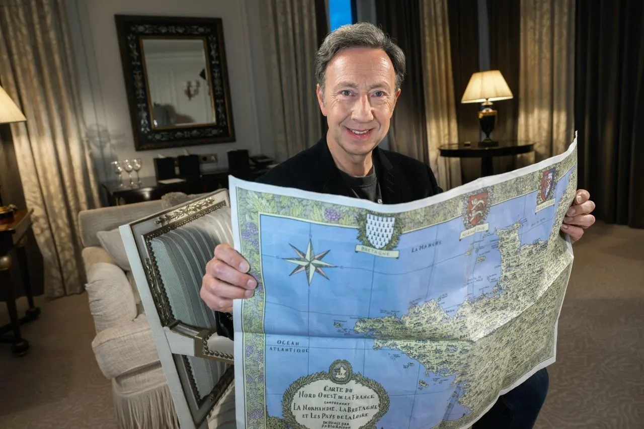Stéphane Bern photographié le 19 novembre 2025 à Paris. Il tient entre ses mains la carte du Grand Ouest dessinée par Pablo Raison et offerte par « Ouest-France » à ses lecteurs avec son édition du 26. © Stéphane Geufroi / Ouest-France