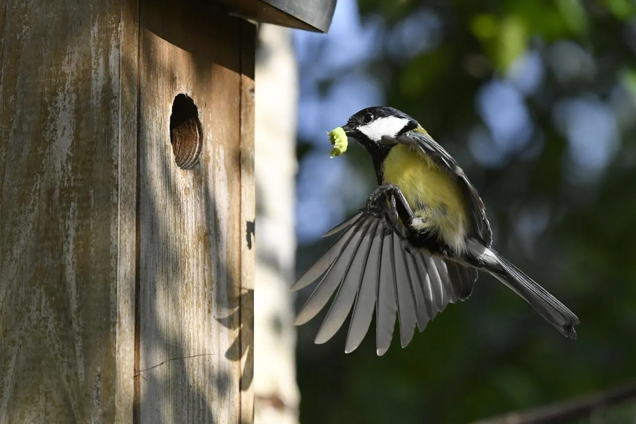 Certains oiseaux se servent des nichoirs dans les jardins. Comme cette mésange charbonnière qui nourrit sa nichée. © Thierry Creux / Archives Ouest-France