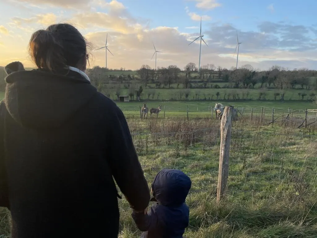 photo aurélie ganet et son fils, dans leur propriété, devant le parc éolien d’échauffour.  ©  ouest-france