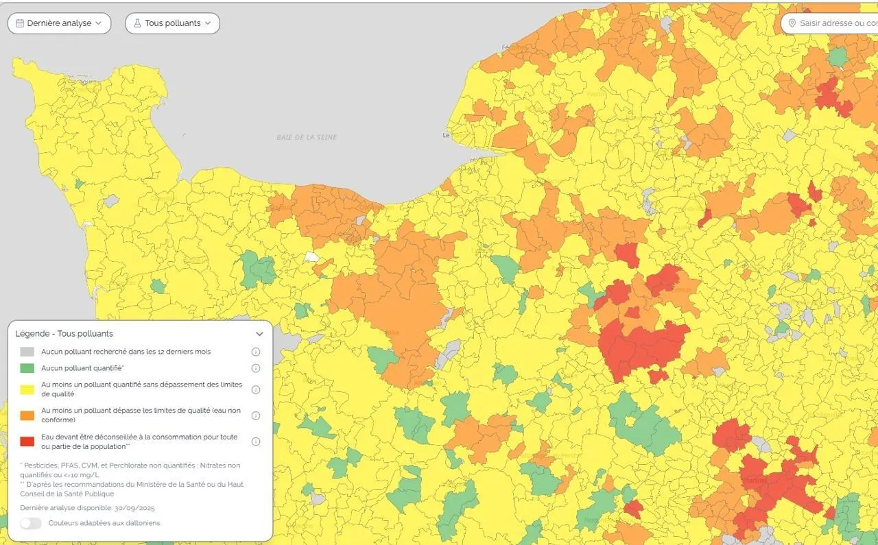 Les ONG Générations Futures et Data For Good proposent une carte interactive sur DansMonEau.fr qui permet de naviguer simplement pour s’informer sur la qualité de l’eau du robinet, et sur les substances qui pourraient s’y trouver. Elle indique quelles sont les communes de Normandie où « l’eau doit être déconseillée à la consommation pour toute ou partie de la population » en ce mois de décembre 2025.