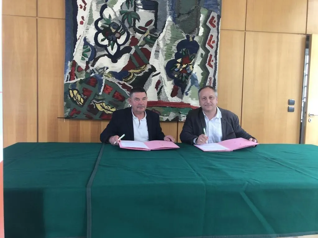 Jacques Fortis, vice président chargé de l’économie à Flers agglo et Christophe Chevallier, président de l’association Materrio Normandie, ont signé une convention, ce mercredi 22 mai 2024. © Ouest-France