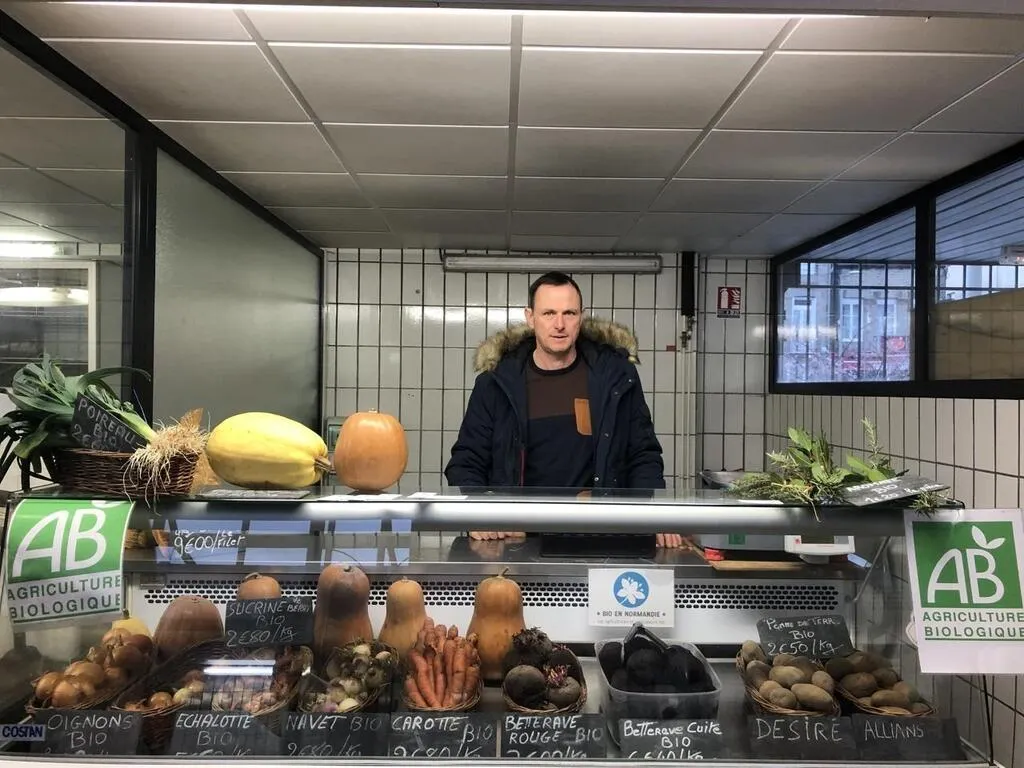 Pour la journée Assiette en scène, Sébastien Villette, maraîcher bio, basé à Saint-Hilaire-de-Briouze, a installé son stand au marché couvert de Flers, dans l’Orne, le dimanche 5 février. © Ouest-France