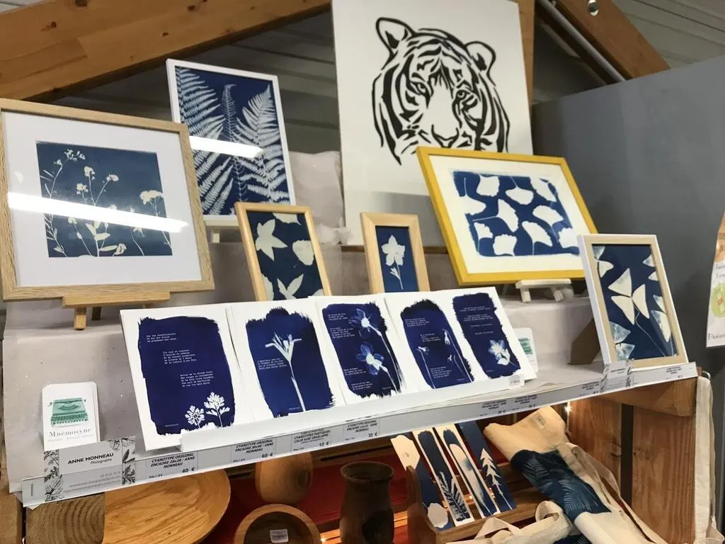 Anne Monneau propose ses cyanotypes poétiques à la Halte paysanne, à Saint-Georges-des-Groseillers. © Ouest-France
