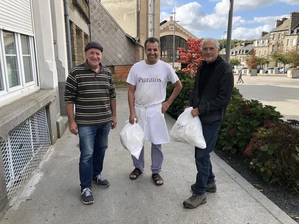 Patrick Picard, président de la confrérie des gastronomes de Flers et Daniel Catherine, vice-président, entourent Mohammed Bihich, boulanger des Délices de Flers, qui a préparé plusieurs centaines de becs de Flers pour la foire de Montilly-sur-Noireau (Orne). © Ouest-France