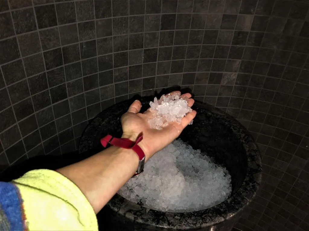 Le sauna, à droite de l’entrée a lui aussi été agrandi. Plus sec, l’espace carbure entre 75 et 80°. De quoi avoir l’impression de griller sur la plage. Quatre personnes peuvent s’allonger sans se gêner. À l’intérieur, rien n’a changé. « L’espace SPA a été insonorisé, ça permet vraiment de se détendre », m’a raconté l’esthéticienne à mon arrivée. En effet, le silence et la chaleur caniculaire du sauna m’apaisent. Après dix minutes de détente, je tente la fontaine à glace. La dame avait raison : c’est agréable !