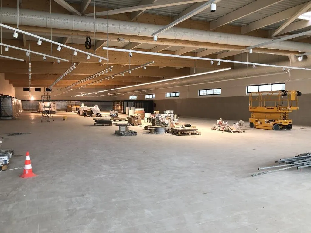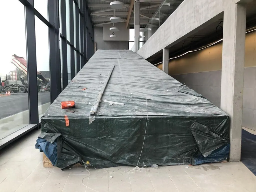 Pour mener les clients vers l’espace de vente, situé à l’étage, des travelators – comprendre des escalators adaptés aux chariots – ont été installés. En attendant d’être mis en route, ils sont encore protégés par de grandes bâches opaques.