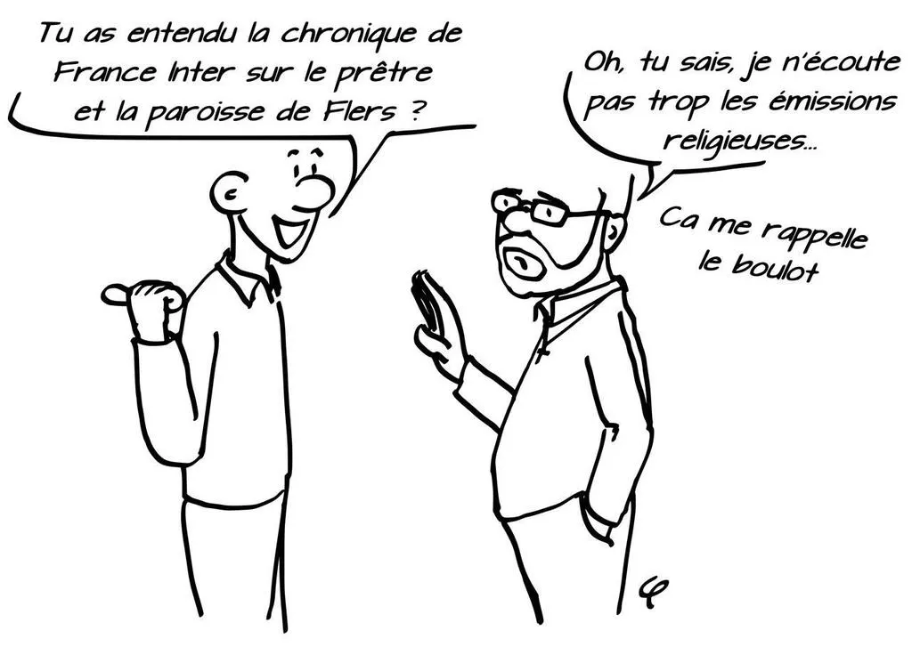 Ce vendredi 5 mars 2021, près d’un an après le début du premier confinement, la chronique de François Morel dans la matinale de France Inter était consacrée aux dessins de Christophe Peschet, prêtre à Flers, dans l’Orne.